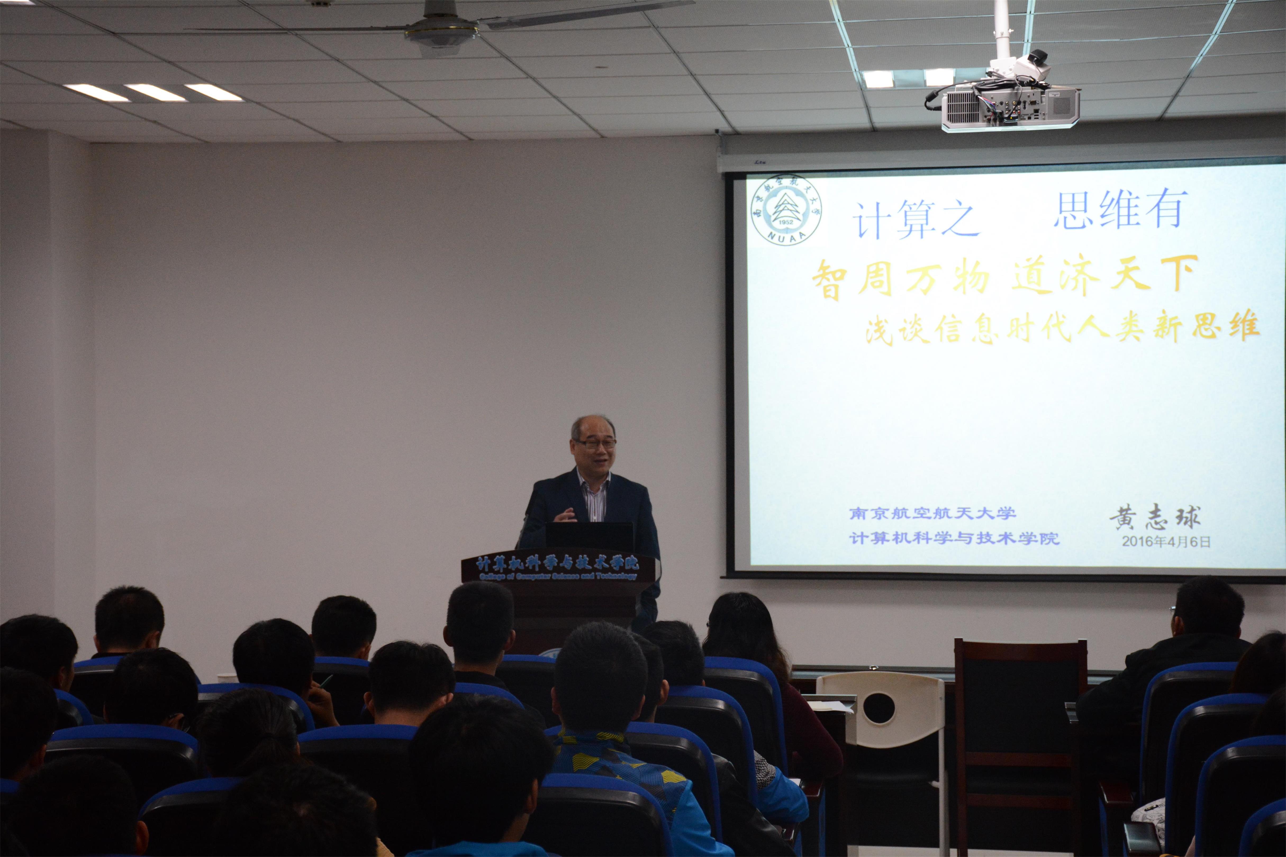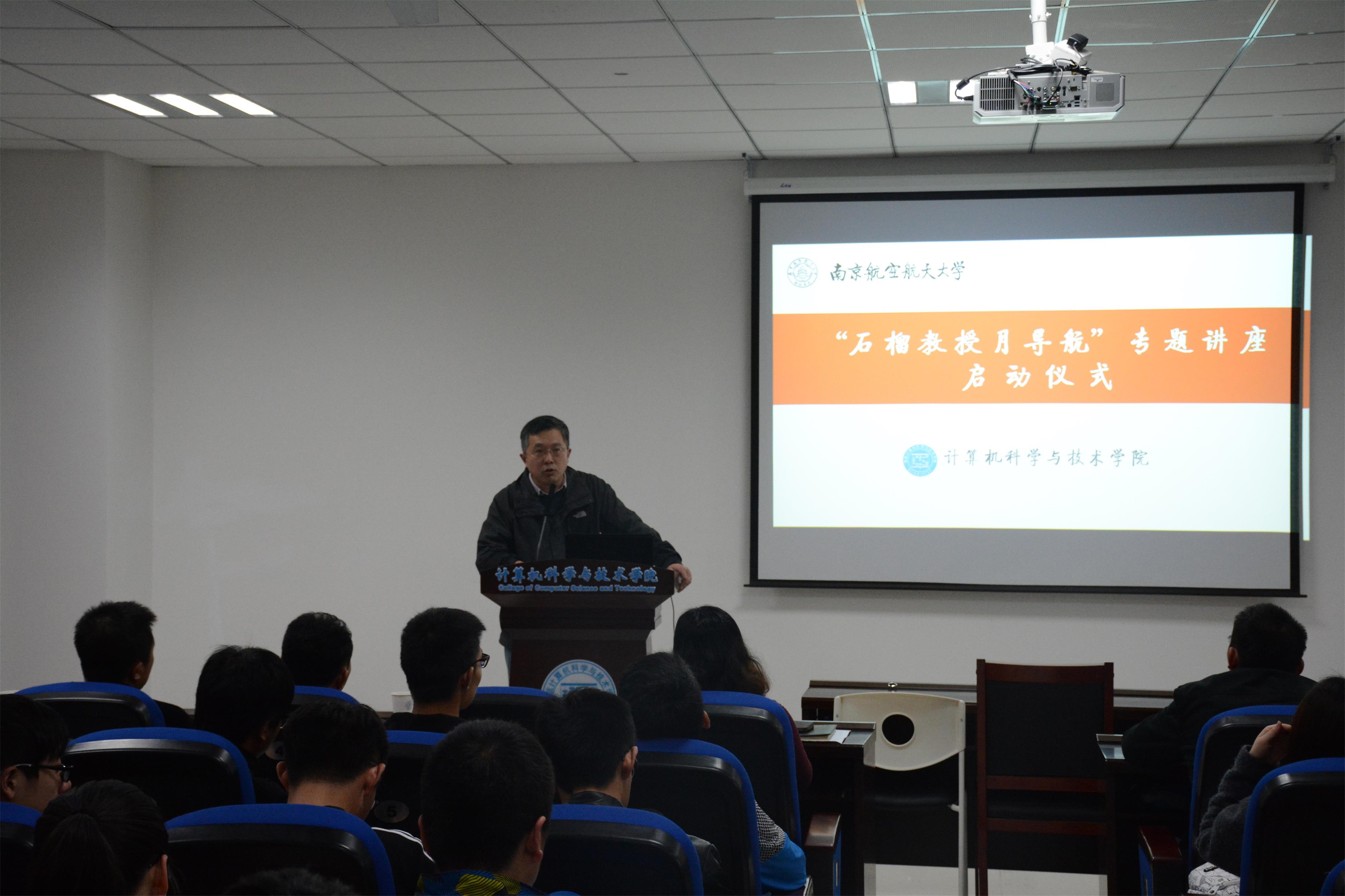 4月6日下午,beat365“石榴教授月导航”启动仪式暨讲座第一讲在学院楼113报告厅举行。beat365院长陈兵主持并宣布活动正式启动,学校副校长黄志球、教务处副处长江爱华、beat365党委副书记王霄、教务处学籍科科长潘顺荣及学院近200名一年级、二年级学生参加。第一讲是学院软件方向学科带头人黄志球副校长主讲的题为“计算之智周万物,思维有道济天下”的学术讲座。