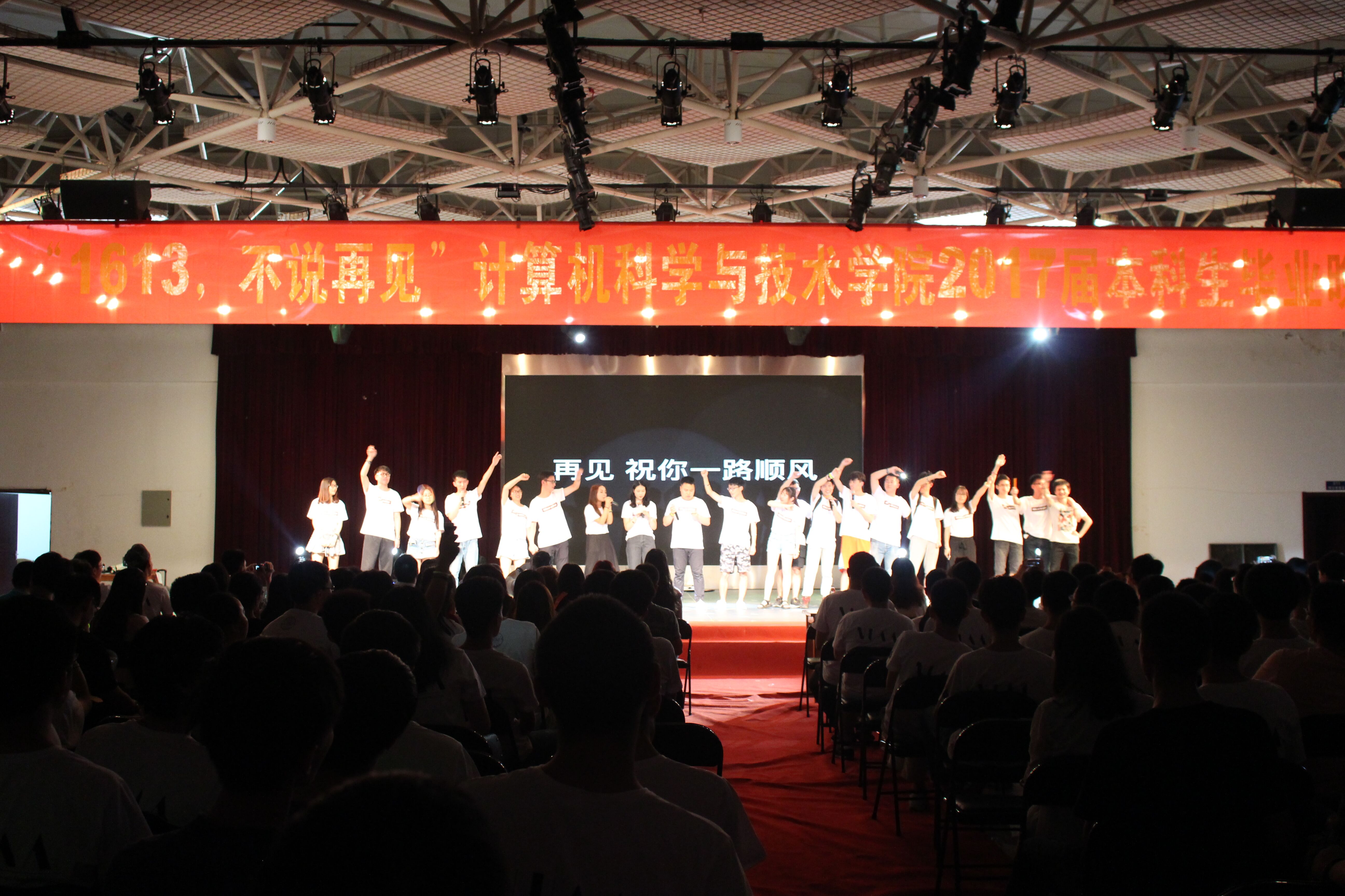 2017年6月17日,“1613,不说再见”计算机科学与技术学院本科生毕业晚会在将军路校区大学生活动中心举行。学院党委副书记王霄、辅导员杨光、石振东以及2017届全体本科毕业生一起观看了演出。