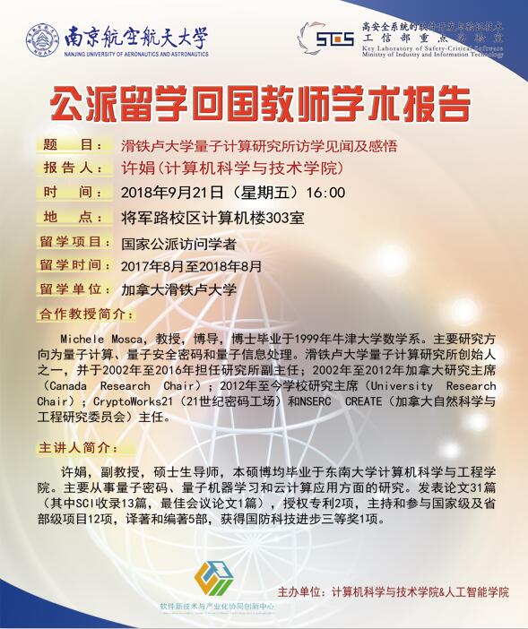 公派留学回国教师学术报告:滑铁卢大学量子计算研究所访学见闻及感悟