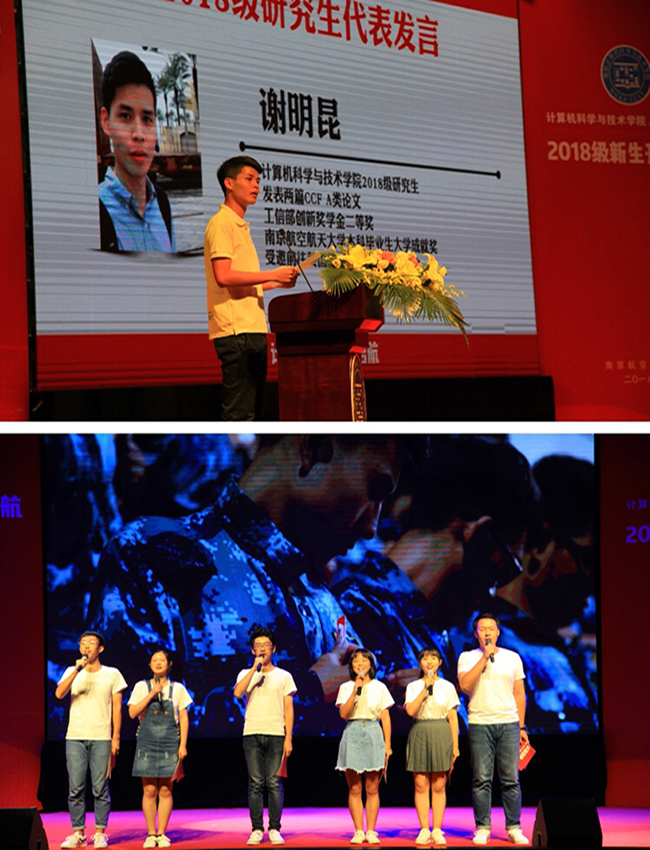 “我们将成为计算机科学与技术学院的新生力量,让更多的人看见,这份我们专属的荣光。”在第三篇章中,6名2018级本科生新生代表首先为在场的观众带来了一首原创诗朗诵。他们通过对“大学初体验”的回忆和描述,传达出对大学新生活的憧憬和向往,更表达出对学校和学院的认可和热爱。精彩的朗诵引起了在场新生的强烈共鸣,现场掌声、喝彩不断。随后,2018级研究生谢明昆作为研究生新生代表发言,他以自己南航“本科毕业生”和“研究生新生”的双重身份切入,以自己的亲身经历鼓舞新入学的本科新生,同时,也表达了自己作为一名研究生新生的激动和自豪。