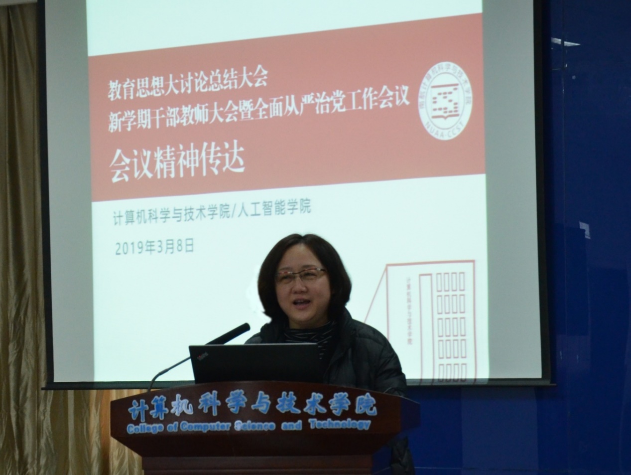 3月8日下午,计算机科学与技术学院/人工智能学院在学院515报告厅召开全院教职工大会,传达学校教育思想大讨论总结大会精神和2019年新学期干部教师大会暨全面从严治党工作会议精神,布置2019年学院重点工作,表彰2018年度学院各项工作中的先进个人。学院党政领导班子成员和全体教职工参加了会议,会议由学院党委副书记管祎主持。