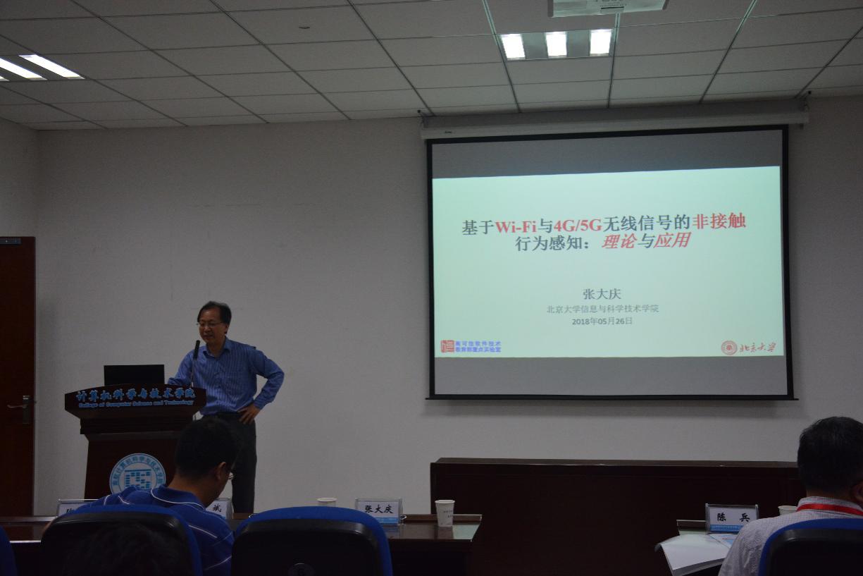 在第一个报告中,北京大学博雅讲席教授张大庆老师给大家做了有关“基于Wi-Fi和4G/5G无线信号的非接触行为感知的理论与应用”的演讲,张大庆教授带领的团队将原于光学和通讯领域的菲涅尔区模型引入到室内无线非接触人体感知领域,并现场演示了基于Wi-Fi的无接触呼吸监测、睡眠监测、室内活跃度监测等一系列的应用系统。