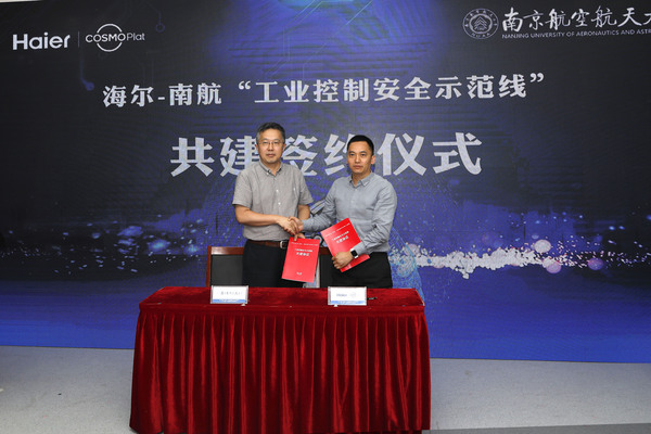 在海尔-南航“智能+”校企协同育人平台共建签约暨“智能+”科技创新大赛启动仪式上,施大宁代表学校致欢迎辞,他表示,在新工科建设背景下,海尔与南航洽谈校企协同育人,是顺应和契合新工科背景下人才培养的迫切需要,这是机遇和动力,更是挑战和压力。通过海尔-南航“智能+”校企协同育人平台,校企双方一定可以充分发挥各自特长,促进教育链、人才链与产业链、创新链有机衔接,实现资源共享、信息共享、优势互补、合作共赢。陈录城代表海尔讲话,他围绕“我们为什么共建‘智能+’校企协同育人平台”、“我们共建‘智能+’校企协同育人平台有哪些优势”、“我们如何共建‘智能+’校企协同育人平台”三个问题展开,回溯了合作的背景,并充分肯定了此次“智能+”校企协同育人平台共建的重要意义。施大宁和陈录城共同签署海尔-南航“智能+”校企协同育人平台共建协议。根据协议,校企双方将实现各类科创基地的资源共享,为新工科人才培养提供有力的基础条件与政策保障。之后,校企双方还签约了工业控制安全示范线共建协议,并共同为海尔-南航工业智能联合实验室揭牌。