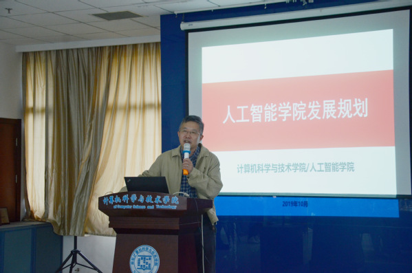 陈兵向老教师们介绍了学院一年来的发展状况,重点介绍了人工智能学院和人工智能研究院的成立和建设情况,并简要介绍了学院在人工智能发展领域的相关计划、学院目前已取得的成绩以及未来的发展规划与目标。