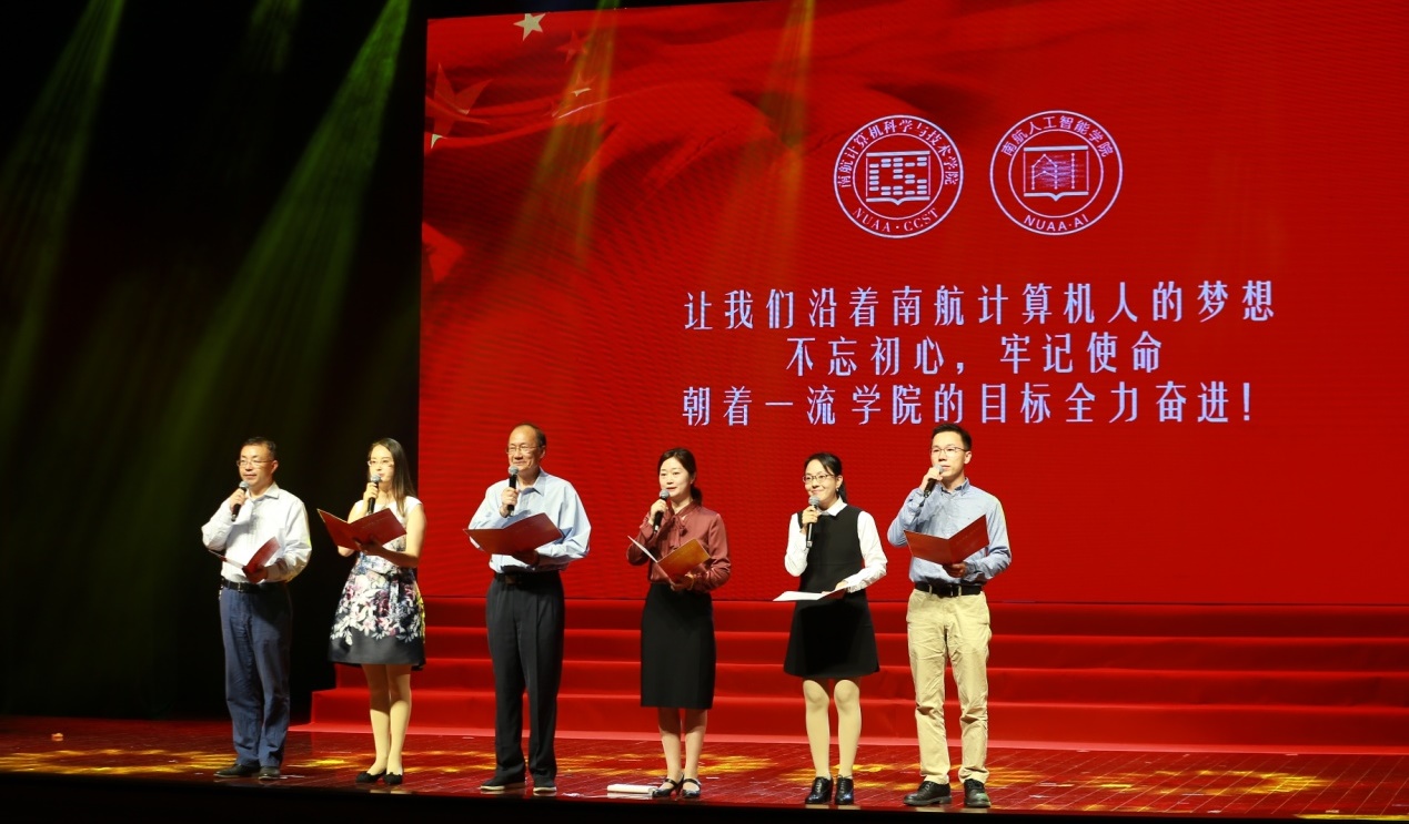 在第二篇章,学院老中青6名教师代表共同朗诵了《六十年岁月如歌》,回顾了南航计算机从艰难起步到世纪发展再到迈入新时代的一路光辉历程,带领全场观众一起重温了南航计算机人的甲子荣光。