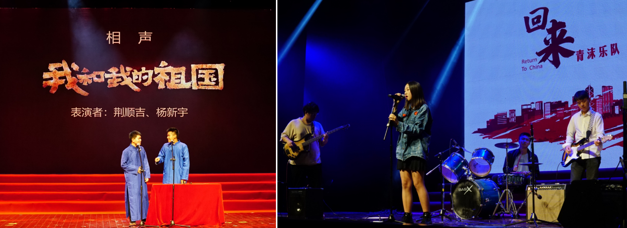 随后,荆顺吉、杨新宇带来了相声《我和我的祖国》,通过一位84岁老人的视角,展现了祖国70年天翻地覆的变化。2019年也是澳门回归20周年,青沫乐队通过一首《回来》,重温了香港回归、澳门回归的伟大时刻。
