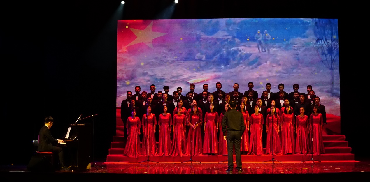 在第一篇章,学院全体党政领导、教师代表、学生代表近60人首先通过一首《四渡赤水出奇兵》合唱,再次重现了红军长征那段不屈不饶的斗争历史,给现场观众带来又一次的心灵震撼。