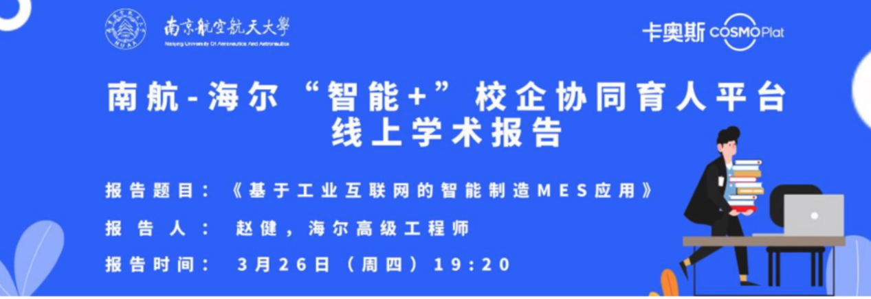 3月26日,计算机科学与技术学院/人工智能学院以南航-海尔“智能+”校企协同育人平台为依托,邀请了海尔高级工程师赵健以“基于工业互联网的智能制造MES应用”为主题,开启了云端讲堂,吸引了全校师生以及部分企业技术人员共计三百余人参加。