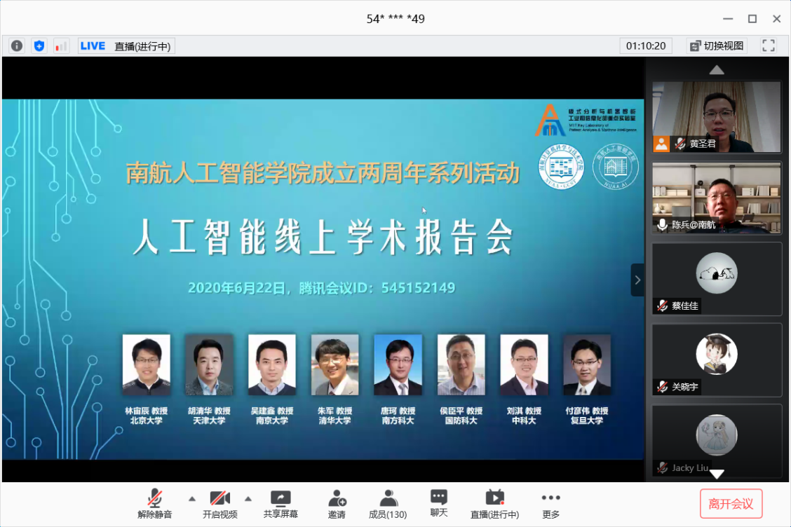 南京航空航天大学人工智能学院成立两周年之际,学院于6月22日举办了人工智能线上学术报告会。会议邀请北京大学林宙辰教授、天津大学胡清华教授、南京大学吴建鑫教授、清华大学朱军教授、南方科技大学唐珂教授、国防科技大学侯臣平教授、中国科学技术大学刘淇教授和复旦大学付彦伟教授等专家做学术报告。会议采用腾讯会议在线上开展,并进行了同步直播。会议吸引了三百余人参加,取得圆满成功。