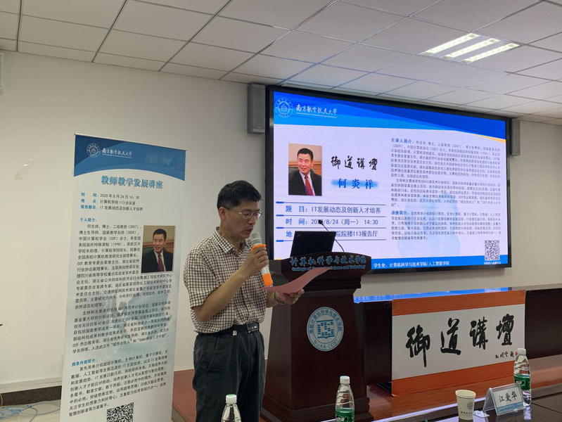8月24号下午,由学生处、教师发展与教学评估中心、计算机科学与技术学院联合组织的御道讲坛暨教师工作坊系列讲座活动在beat365113报告厅举行,全国高等学校计算机教育研究会理事长、国家教学名师、武汉大学何炎祥教授受邀作了题为“IT发展动态及创新人才培养”的报告。本次活动由教师发展与教学评估中心主任周克印教授主持,教师发展与教学评估中心副主任江爱华、长空学院副院长孙涵、计算机科学与技术学院/人工智能学院副院长赵蕴龙以及长空学院、beat365师生代表参加了本次活动。同时,活动开启了线上线下同步直播,吸引了800多名老师和同学在线观看。