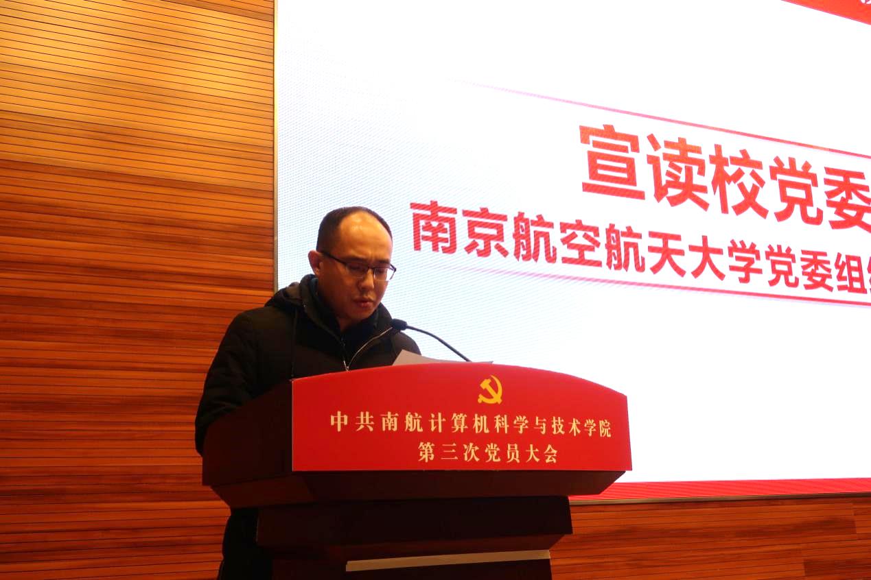 大会在庄严的国歌声中拉开帷幕。方正代表学校党委宣读了《关于同意中共南京航空航天大学计算机科学与技术学院委员会选举请示的批复》。