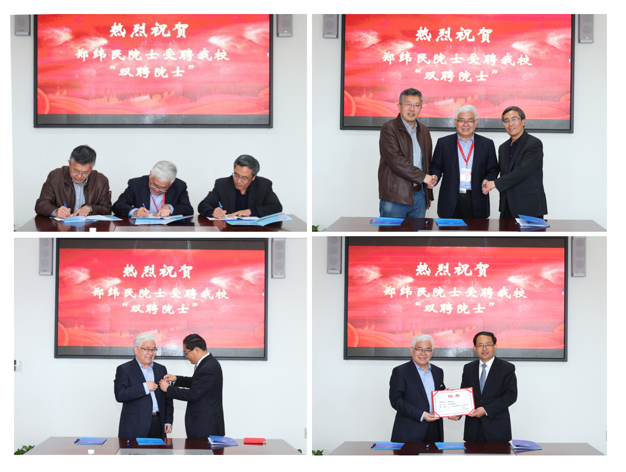 授聘仪式现场,单忠德为郑纬民院士颁发聘书佩戴校徽,并签订了“双聘院士”聘任合同。
