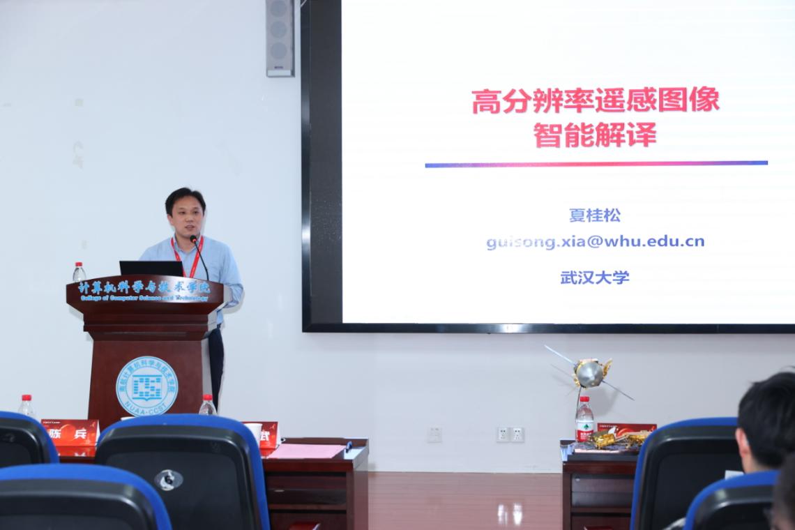 夏桂松教授就“高分辨率遥感图像智能解译”做了专题报告。他围绕遥感图像分类、地物语义分割、目标检测、变化检测等任务,分享了从数据准备到算法设计的经验。