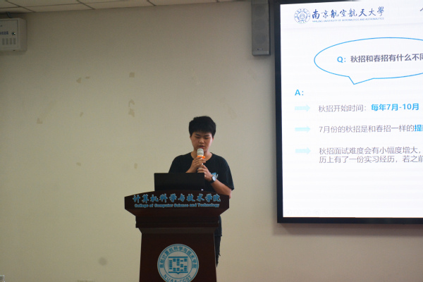 随后,刘梦瑶从初期职业规划、入职和职业规划刷新三个方面向同学们分享了自己的求职过程。她结合自身经历建议同学们选择岗位时要从自身兴趣和能力出发,除技术岗位外,也可以考虑非技术岗位。她鼓励同学们刚入职时不必畏惧,最重要的是要找准个人定位与角色。