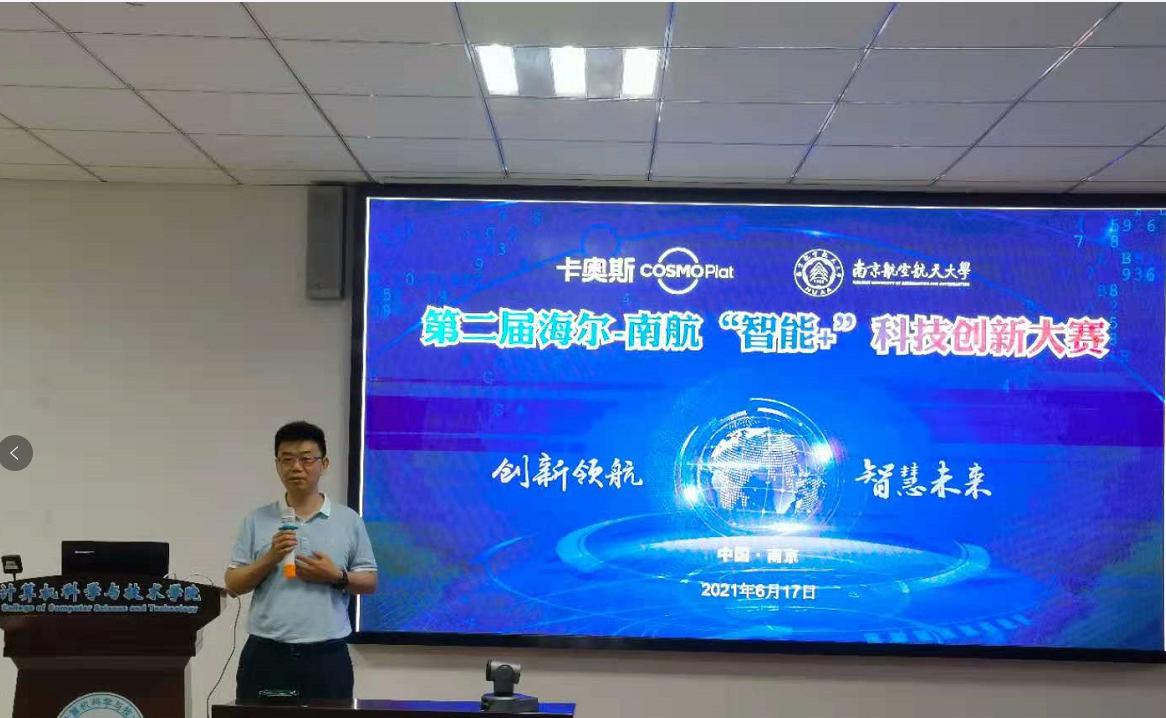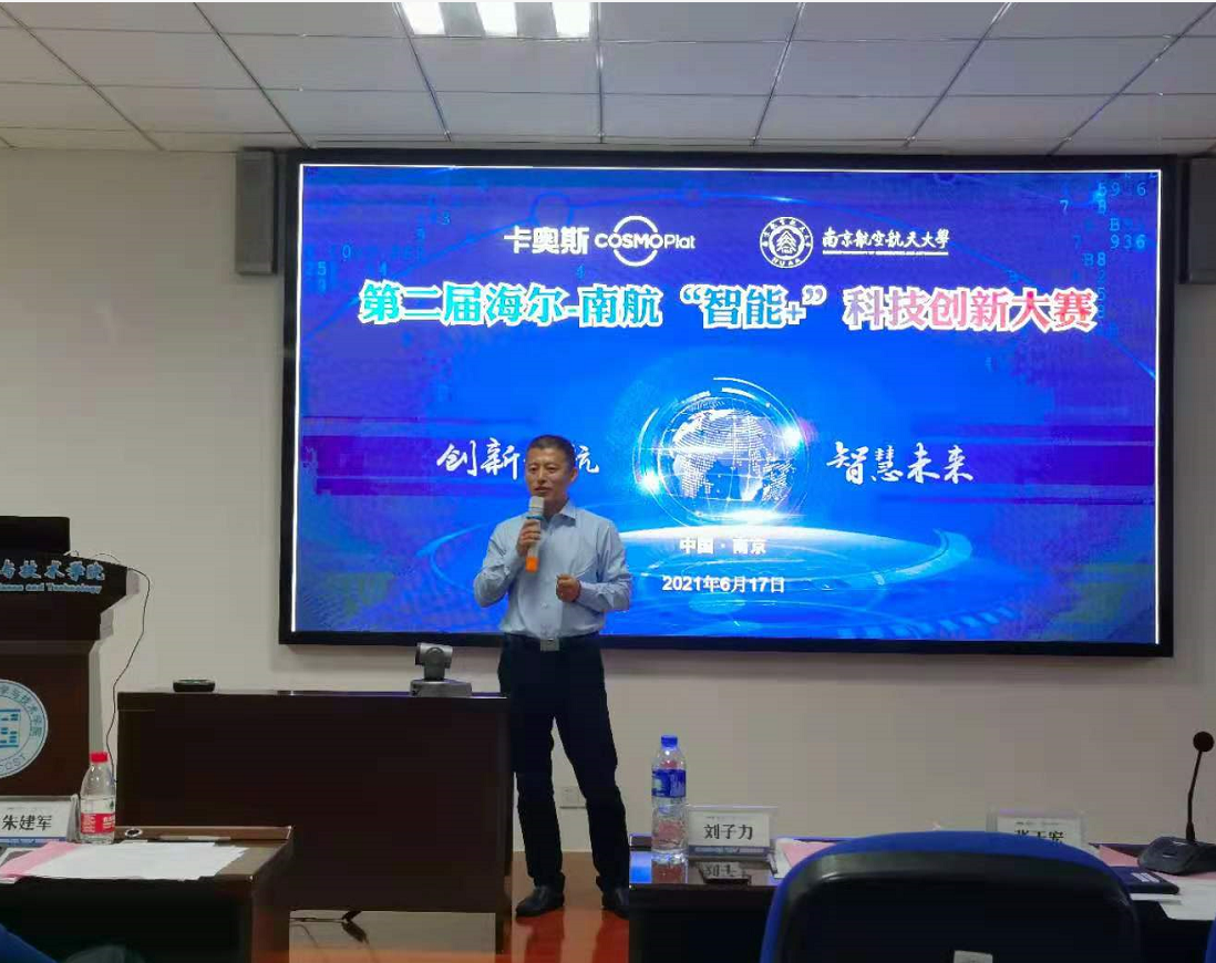 6月17日,第二届海尔-南航“智能+”科技创新大赛决赛评审及颁奖典礼在我校顺利举行。海尔工业智能研究院副院长刘子力、教务处副处长朱建军、能源与动力学院副院长张天宏、电子信息工程学院副院长张小飞、航天学院副院长朱旭东、计算机科学与技术学院/人工智能学院副院长赵蕴龙、院长助理李鑫、以及参赛师生共计60余人参加了现场活动。此次决赛采用线上线下同时评审的方式,邀请了多名专家进行直播评审,参加线上评审的专家有海尔工业智能研究院邓友良、贾冬冬、张天、诸葛慧玲等。