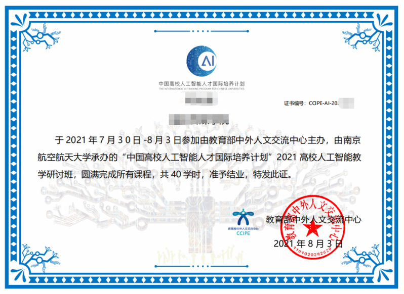 7月30日至8月3日,“中国高校人工智能人才国际培养计划”2021高校人工智能教学研讨班(南京航空航天大学)成功举办。本次研讨班由教育部国际合作与交流司、科学技术与信息化司指导,教育部中外人文交流中心主办,南京航空航天大学承办。来自南京大学、复旦大学、西安电子科技大学等全国近50所高校的100余名教师参加研讨班并顺利结业。