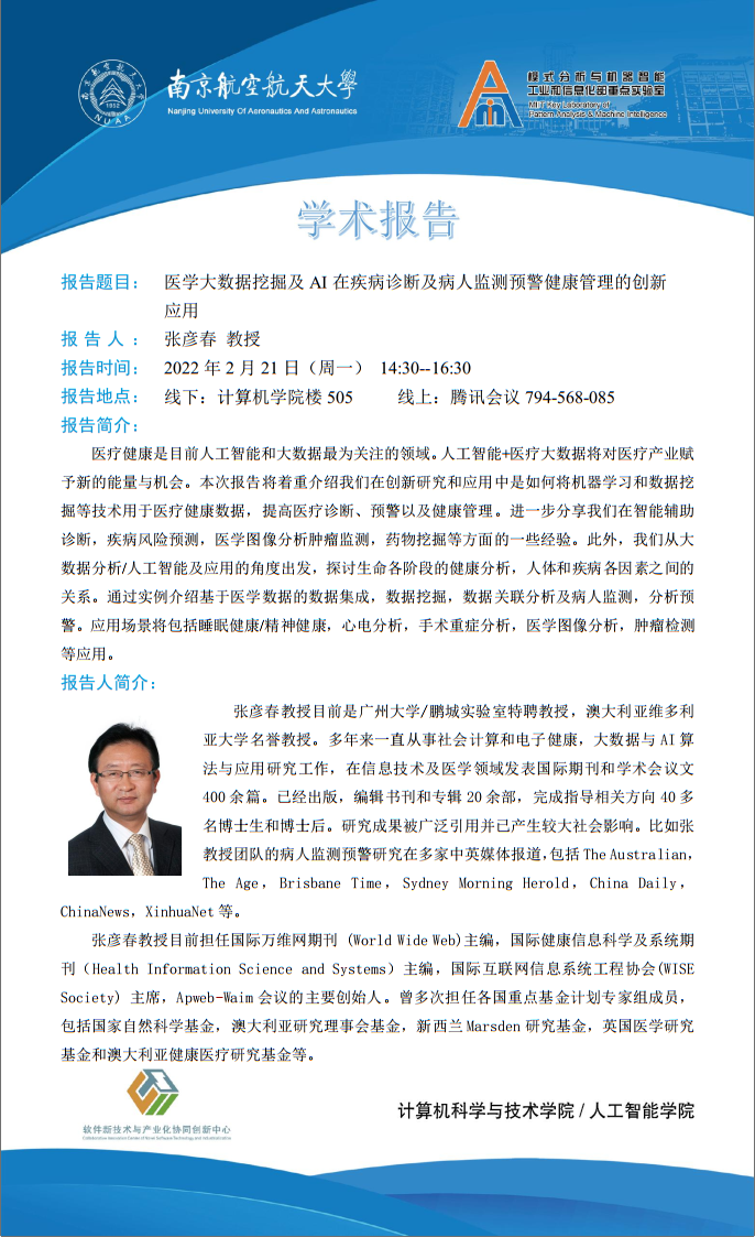 【石榴大讲堂】医学大数据挖掘及AI在疾病诊断及病人监测预警健康管理的创新应用
