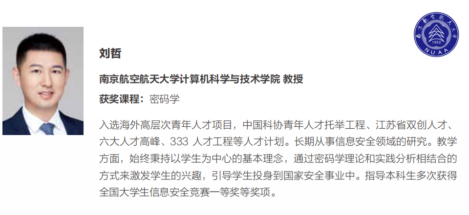刘哲,国家青年特聘专家,南京航空航天大学计算机科学与技术学院教授、博导、海外高层次青年人才项目,中国科协青年人才托举工程、江苏省双创人才、六大人才高峰、333 人才工程等人才计划。长期从事信息安全领域的研究,主讲密码学,通过密码学理论和实践相结合的方式来激发学生的学习兴趣。目前担任ACM中国SIGSAC秘书长、ACM中国SIGBED副主席及《IEEE Internet of Things Journal》等多个期刊的编委,担任CHES 2020/2021, WASA 2021, INSCRYPT 2019等信息安全领域国际学术会议主席。曾获得《麻省理工科技评论》中国区“35 岁以下科技创新35 人”、中国密码学会密码创新奖一等奖、阿里巴巴达摩院青橙奖、中国密码学会优秀青年奖,ACM SIGSAC中国新星奖及卢森堡国家自然科学基金委杰出博士毕业论文奖等奖项。指导本科生多次获得全国大学生信息安全竞赛一等奖等奖项。