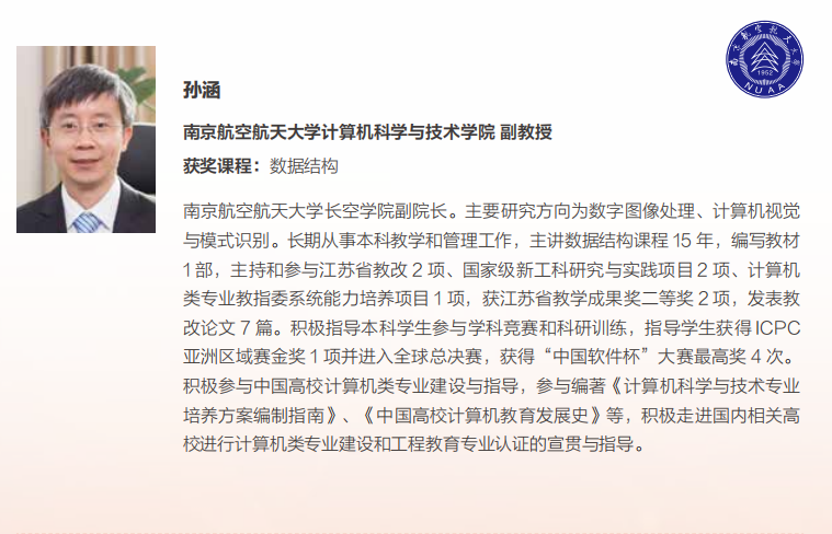 孙涵,南京航空航天大学计算机科学与技术学院副教授,南航长空学院副院长。主要研究方向为数字图像处理、计算机视觉与模式识别。长期从事本科教学和管理工作,主讲数据结构课程15年,编写《数据结构:抽象建模、实现与应用》教材1部,主持和参与江苏省教改2项、国家级新工科研究与实践项目2项、计算机类专业教指委系统能力培养项目1项,获江苏省教学成果奖二等奖2项,发表教改论文7篇。发表科研论文50余篇,发明专利授权6项,主持和参与多项国家自然科学基金、国防等科研项目,获得国防科技进步奖三等奖1项。指导学生获得ACM ICPC亚洲区域赛金奖1项并进入全球总决赛,获得“中国软件杯”大赛最高奖4次。参与编著《计算机科学与技术专业培养方案编制指南》、《中国高校计算机教育发展史》等。