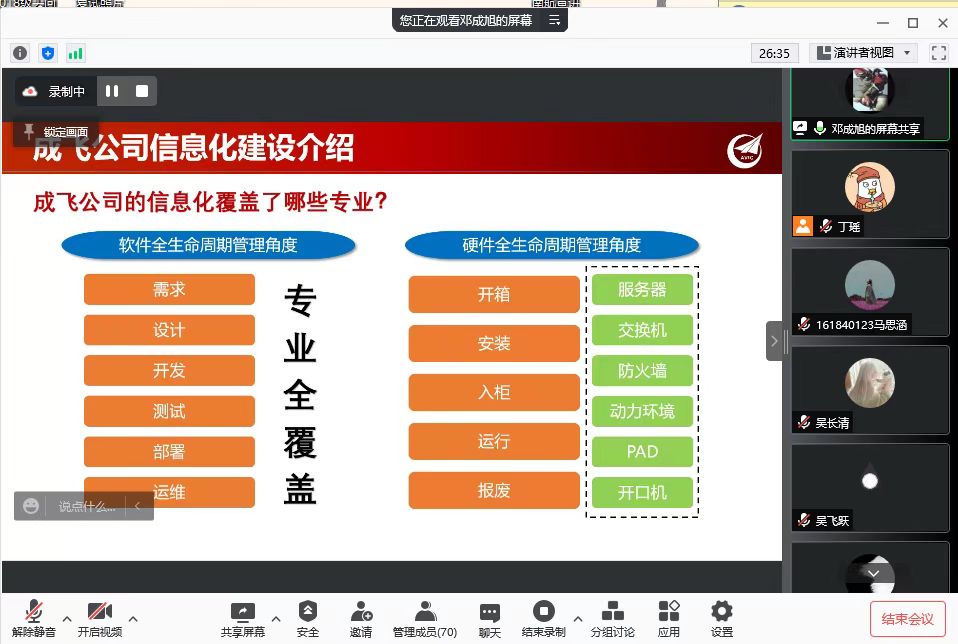随后,邓陈旭介绍了成飞公司信息化建设的具体情况,详细阐述了成飞信息化的发展方向和IT架构。他表示成飞公司的信息化建设需要更多计算机人才的加入,他激励与会的计算机学子投身国防建设,用信息化为国防科技的发展提速赋能。