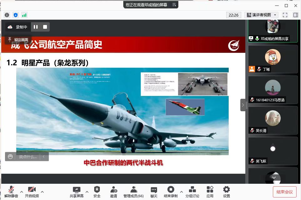 首先,邓陈旭围绕“三个基地”对成飞公司的发展历程以及在航空领域的成就进行了详细介绍。他向同学们展示了获得多个“中国第一”的明星产品以及中巴合作研制的两代半战斗机,充分展现了成飞公司紧跟国家需求、服务国防发展的战略。