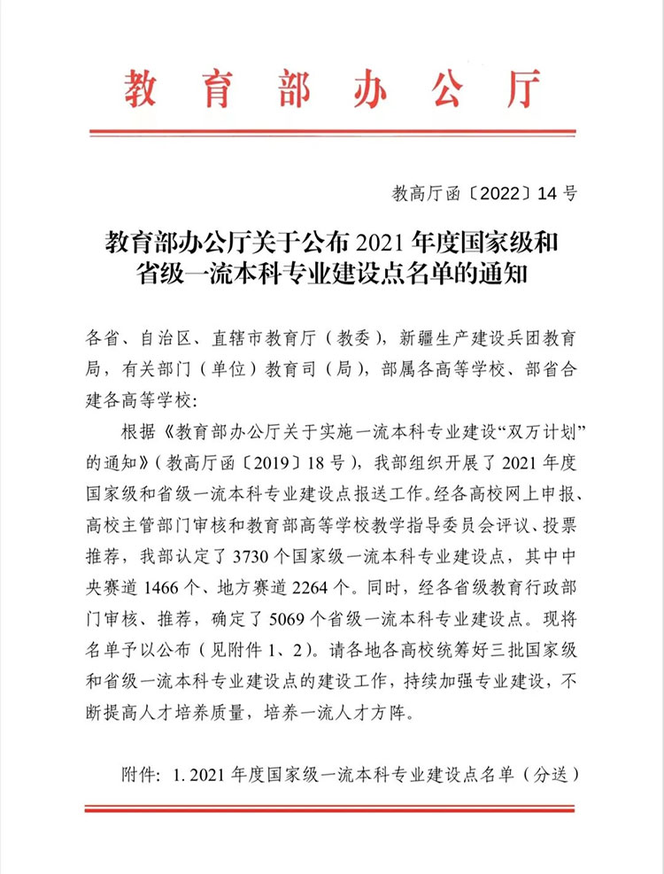 近日,教育部印发《教育部办公厅关于公布2021年度国家级和省级一流本科专业建设点名单的通知》,我院申报的信息安全和物联网工程2个专业均入选国家级一流本科专业建设点。