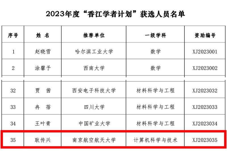 近日,全国博士后管委会办公室公示了2023年度“香江学者计划”入选名单,beat365耿传兴老师成功入选,是南京航空航天大学两位入选者之一。