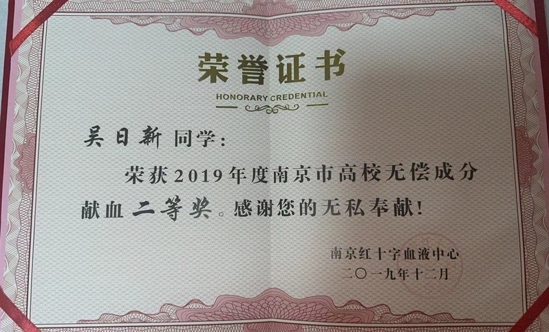 12月11日,经过3个多小时的采集、分离,吴日新最终成功捐献164毫升造血干细胞混悬液,成为学校首例、江宁区第6例、南京市第27例造血干细胞大学生捐献者,荣获江苏省红十字会“博爱奖章”,得到社会的广泛关注和认可。