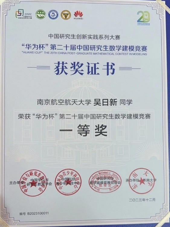 吴日新不仅多次在志愿服务中诠释奉献精神,同时也是一名才华出众的“学术达人”。在校期间,他认真勤勉,先后荣获2020年全国大学生数学建模竞赛本科组一等奖和2023年中国研究生数学建模竞赛全国一等奖等,展现出他在数学领域的卓越才华和优秀的团队协作能力。现已完成科研论文2篇,其中1篇已被SCI一区期刊录用,公开发明专利2项。