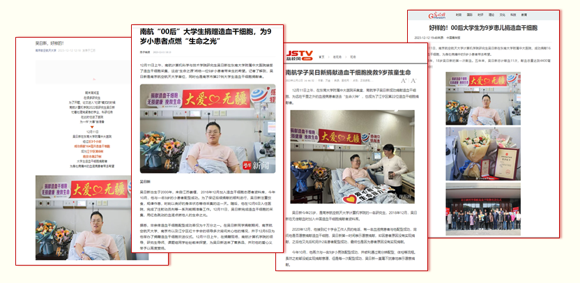 吴日新用实际行动感染带动着身边人,为大家树立了榜样。在他的影响下,导师王然及课题组多名成员均已加入中华骨髓库,课题组形成了奉献、担当、互助的氛围。他的善举不仅是对生命个体的无私帮助,更是当代大学生勇担社会责任和弘扬奉献精神的充分彰显。他的事迹先后在扬子晚报、光明网、江宁发布、南航官微等平台直播、报道,起到了良好的示范效应。