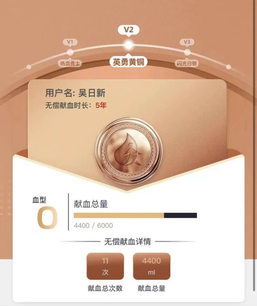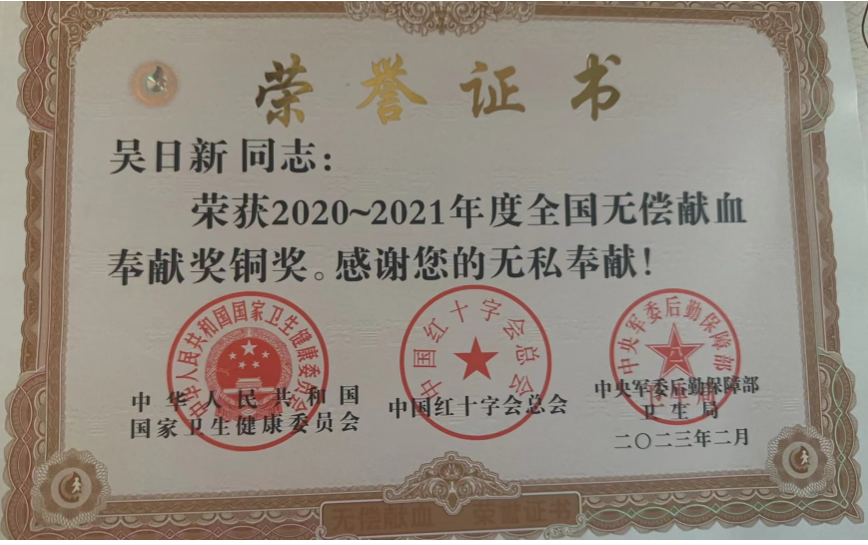 吴日新出生于2000年。2018年,他在南京市献血屋献出了人生中的第一个400ml,五年来他已累计献血11次,献血量达4400ml,相当于一名成年人的全身血量,充分彰显了当代大学生勇担社会责任和无私奉献的精神风貌,获评全国无偿献血奉献奖铜奖、南京市高校无偿成分献血二等奖,大家都亲切地称呼他为“热血少年”。